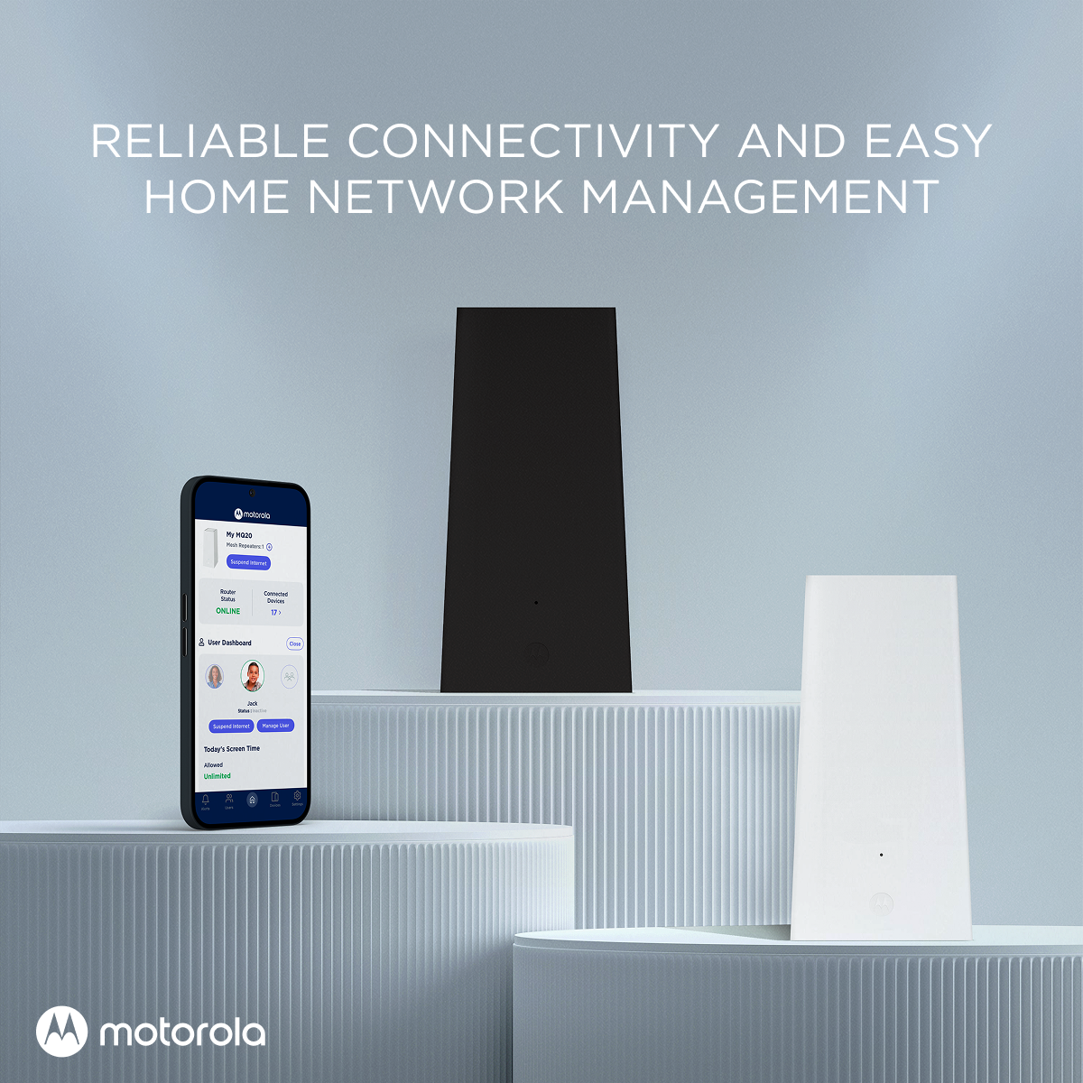 - Easily manage your home network with the free MotoSync+ app. Set up in minutes, customize parental controls, get real-time alerts, and control device access from anywhere. Advanced firewall, real-time malware blocking, ransomware protection, and phishing defense provide enterprise-level security for every connected device, 24/7