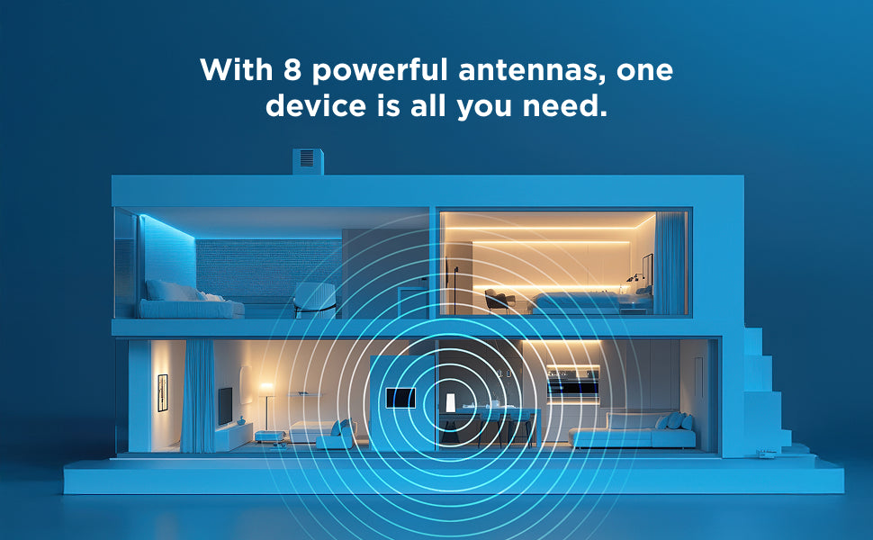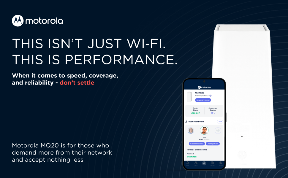 Motorola delivers whole-home coverage in a single, powerful device, saving space and simplifying setup. One MQ20 router is all you need for complete coverage up to 3,000 sq. ft, thanks to 8 high-gain antennas